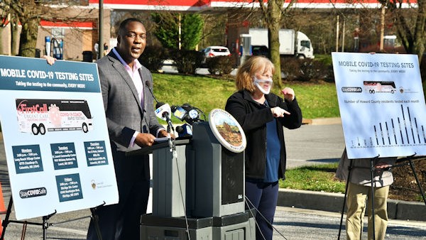 ELLICOTT CITY, MD – Today, Howard County Executive Calvin Ball launched new community-based mobile testing at five rotating locations throughout Howard County. The mobile testing will be operated by First Call Urgent Care, Monday-Friday from 3:00-7:00 p.m. The mobile testing sites were chosen to remove barriers to access for communities as school buildings reopen. Locations are walkable to surrounding communities and along bus routes. Photos of the event can be found here.