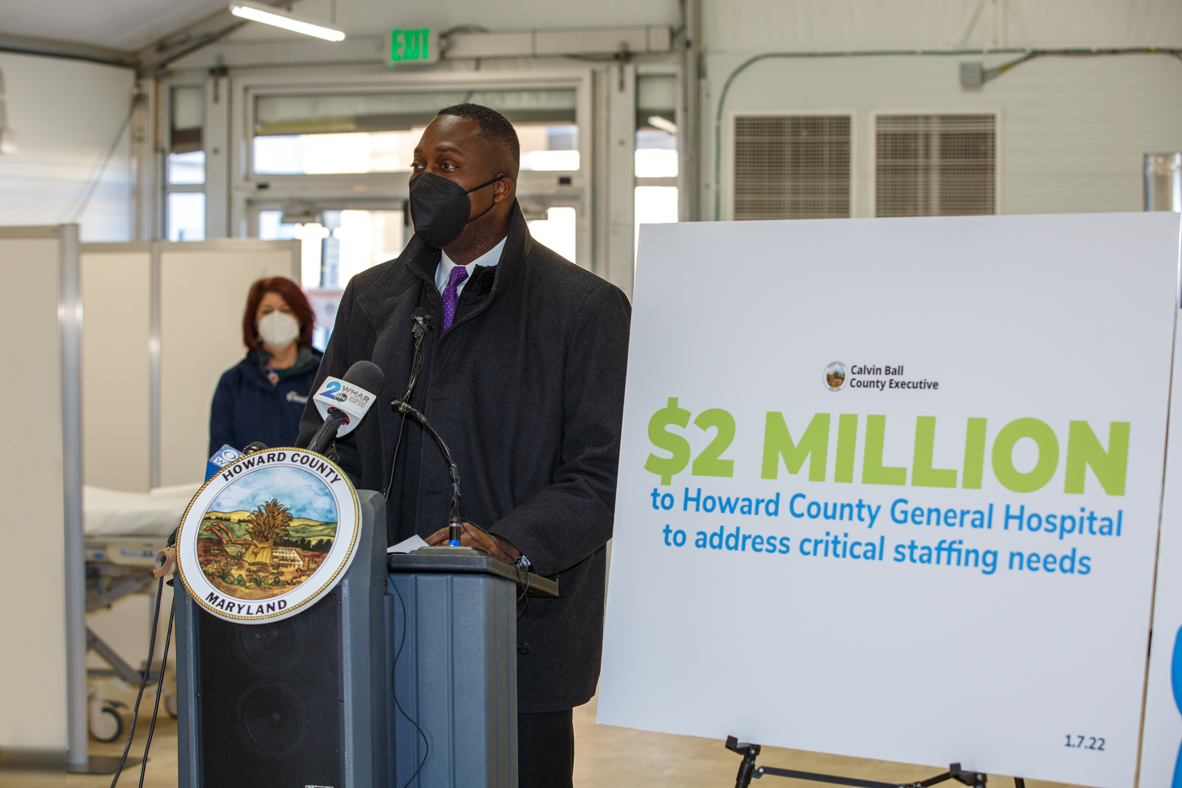 ELLICOTT CITY, MD – Howard County Executive Calvin Ball has committed $2 million to the Howard County General Hospital (HCGH) and $400,000 to the Howard County Health Department in American Rescue Plan funding. The $2.4 million will address critical staffing needs at both organizations amid the latest COVID-19 surge. Photos of the announcement can be found here. Video can be found here.