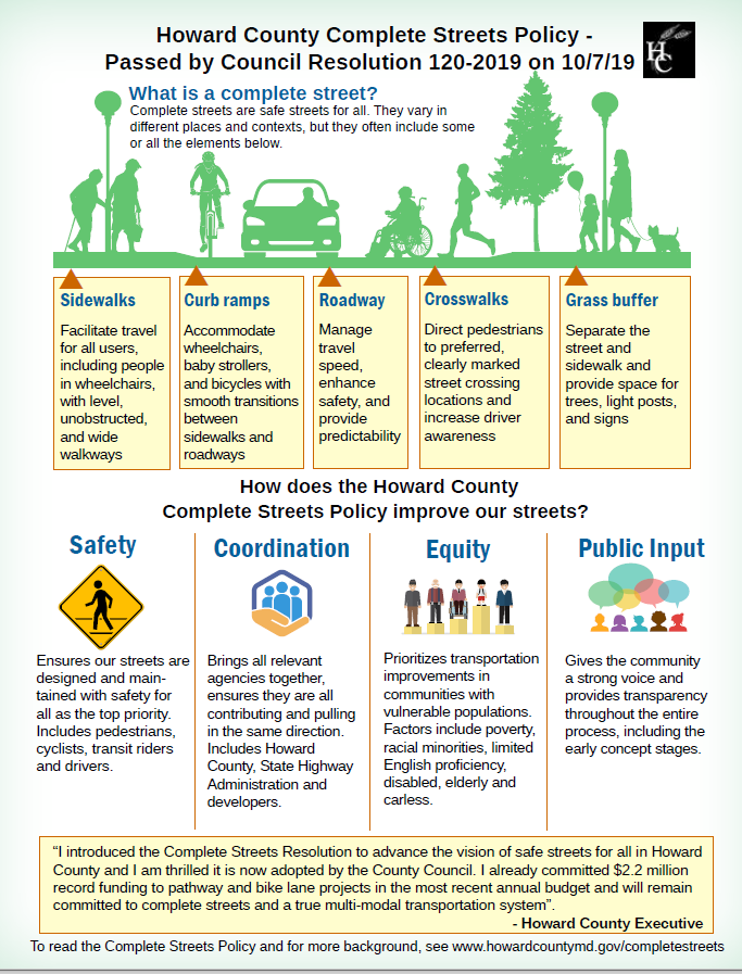 ELLICOTT CITY, MD – The first Howard County Complete Streets Design Manual was approved by the County Council last night, making Howard County one of only six counties nationwide with complete street design guidance in place. The Manual is a technical document that guides County street design, including national best practices and complete streets design concepts that improve safety and accessibility for all users, including drivers, bicyclists, pedestrians, and transit riders.