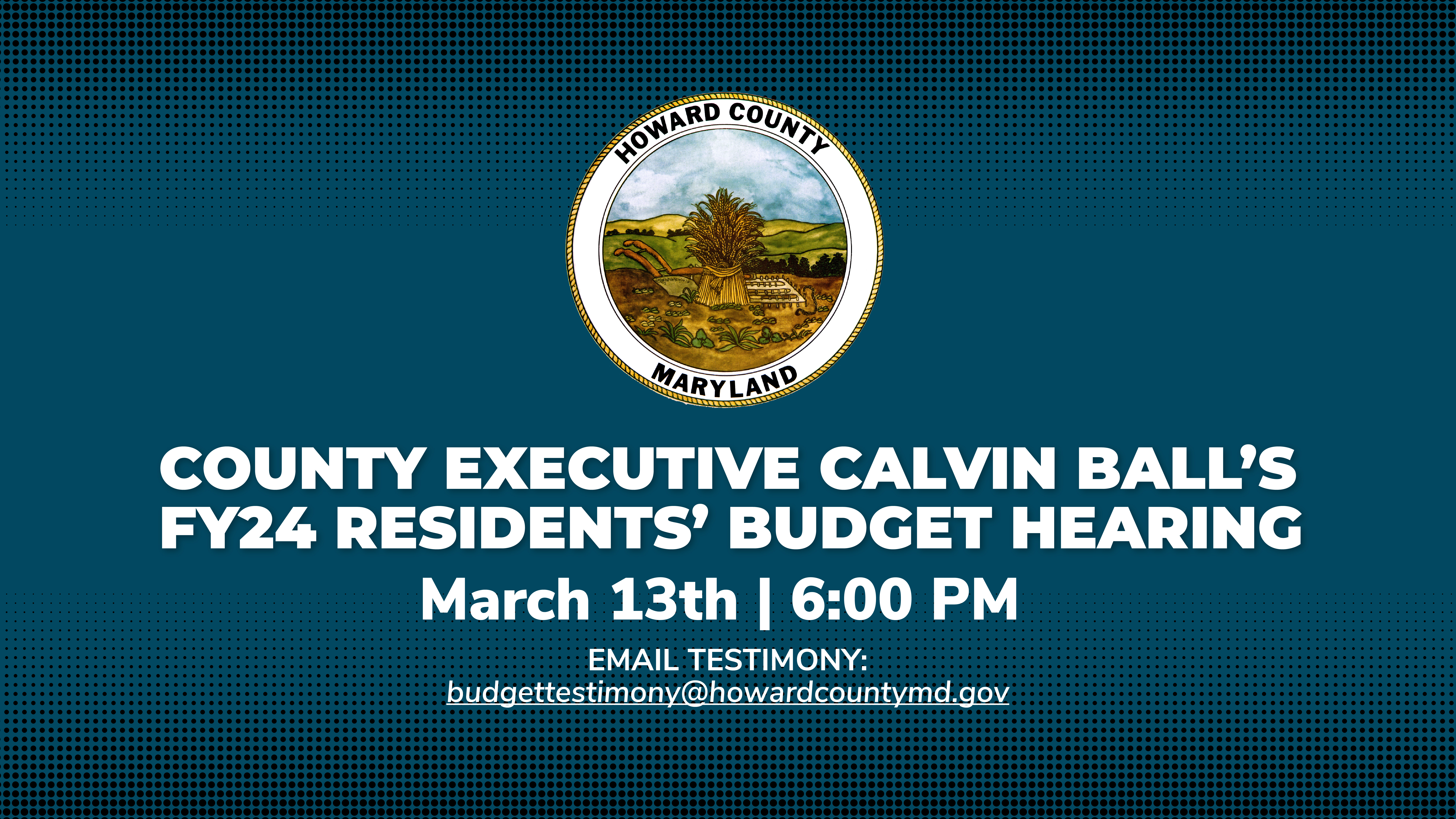 ELLICOTT CITY, MD – Howard County Executive Calvin Ball will hold his second Residents’ Budget Hearing for the Fiscal Year 2024 (FY24) budget cycle on Monday, March 13th at 6:00 p.m. This year’s budget hearing will be held virtually and can be watched live from the County Council’s streaming website. The hearing will be listed under “Upcoming Events.”