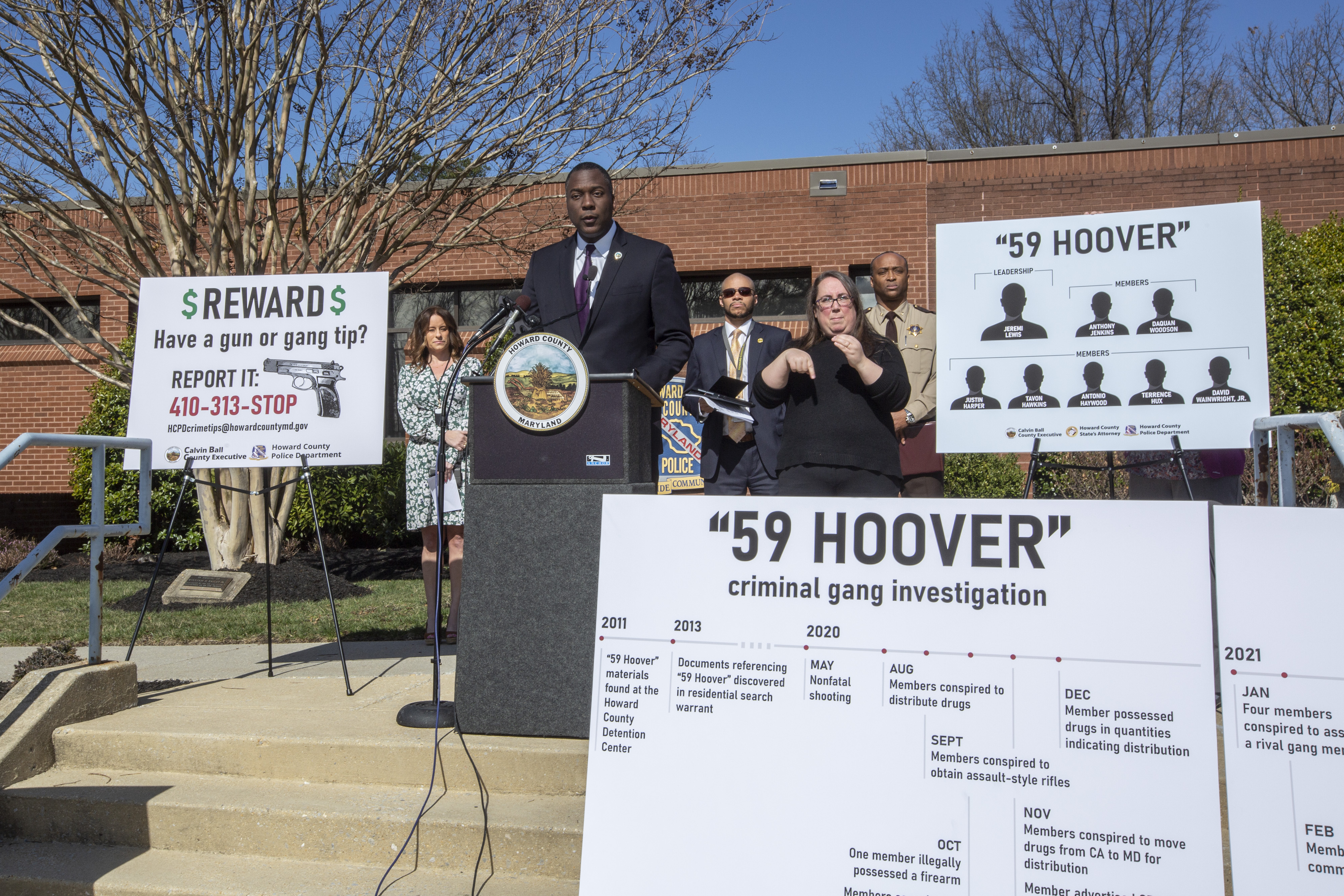 ELLICOTT CITY, MD – Howard County Executive Calvin Ball, Howard County State’s Attorney’s Office, Howard County Police Department, and Howard County Sheriff’s Office announced the indictment of several individuals from the “59 Hoover” criminal gang. Photos of the event can be found here.