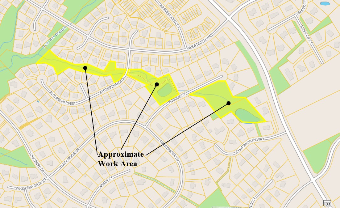 The three project sites are located south of MD 103 between Chatsworth Way and Wheatfield Way. The Manors of Oakwood Pond, located in the open space behind 4618 Chatsworth Way, will be removed and the area restored to a natural vegetated state. The Brampton Hills pond at 4715 Widdup Court will be retrofitted to accommodate the removal of the upstream pond and to bring the pond into compliance with current standards. The unnamed stream, located in an open space extending downstream approximately 800 feet behind several lots and beginning adjacent to 8504 Autumn Harvest, will be stabilized and restored to provide safe conveyance of the runoff. This project is expected to begin by winter 2022.