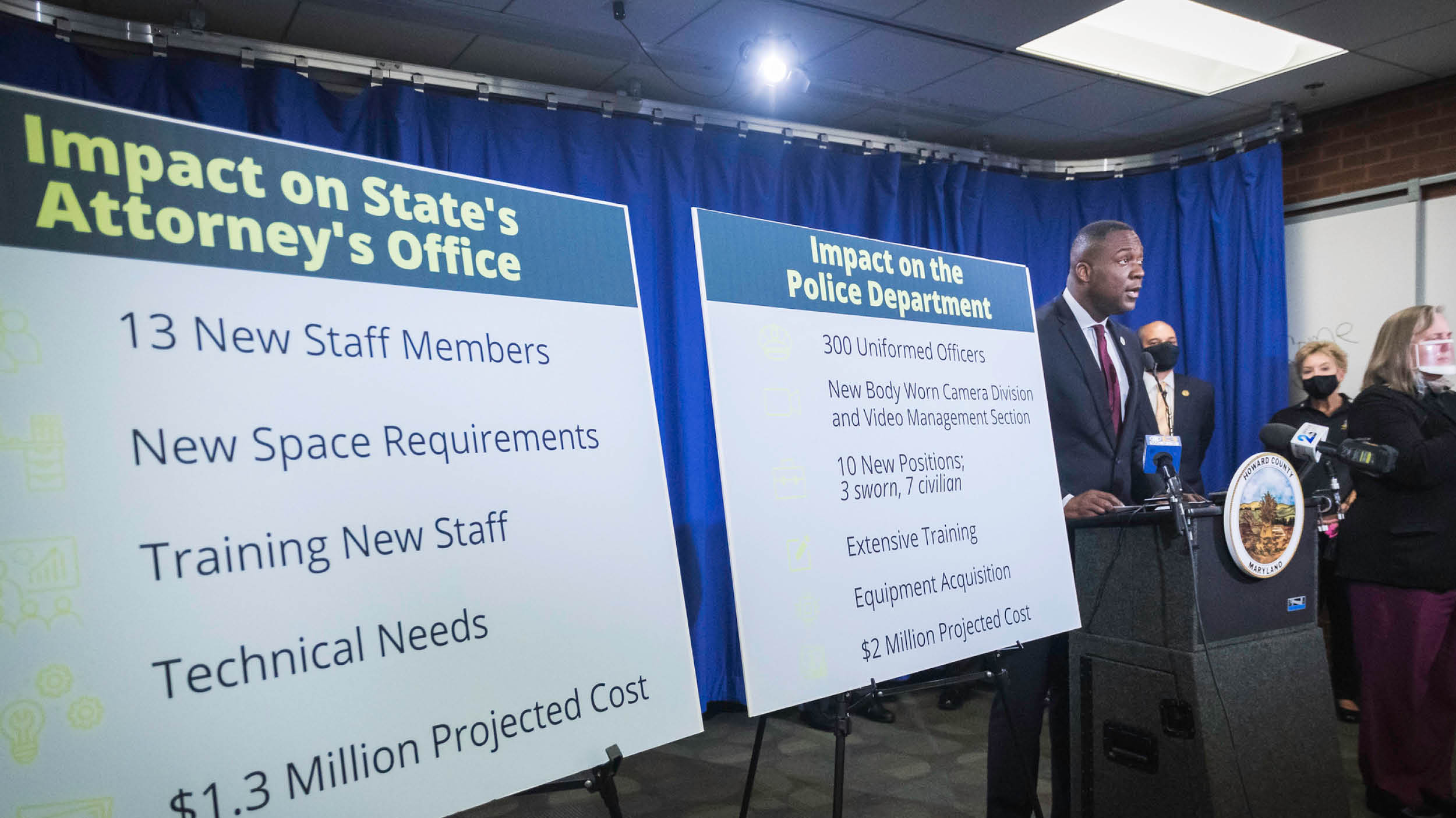 ELLICOTT CITY, MD – Today, Howard County Executive Calvin Ball announced the implementation of a body worn camera program will be included in his Fiscal Year 2022 (FY 2022) operating budget. The approximately $3.2 million-dollar program would include the Howard County Police Department, Sheriff’s Office and staffing needs for the State’s Attorney’s Office. Photos of the event can be found here.