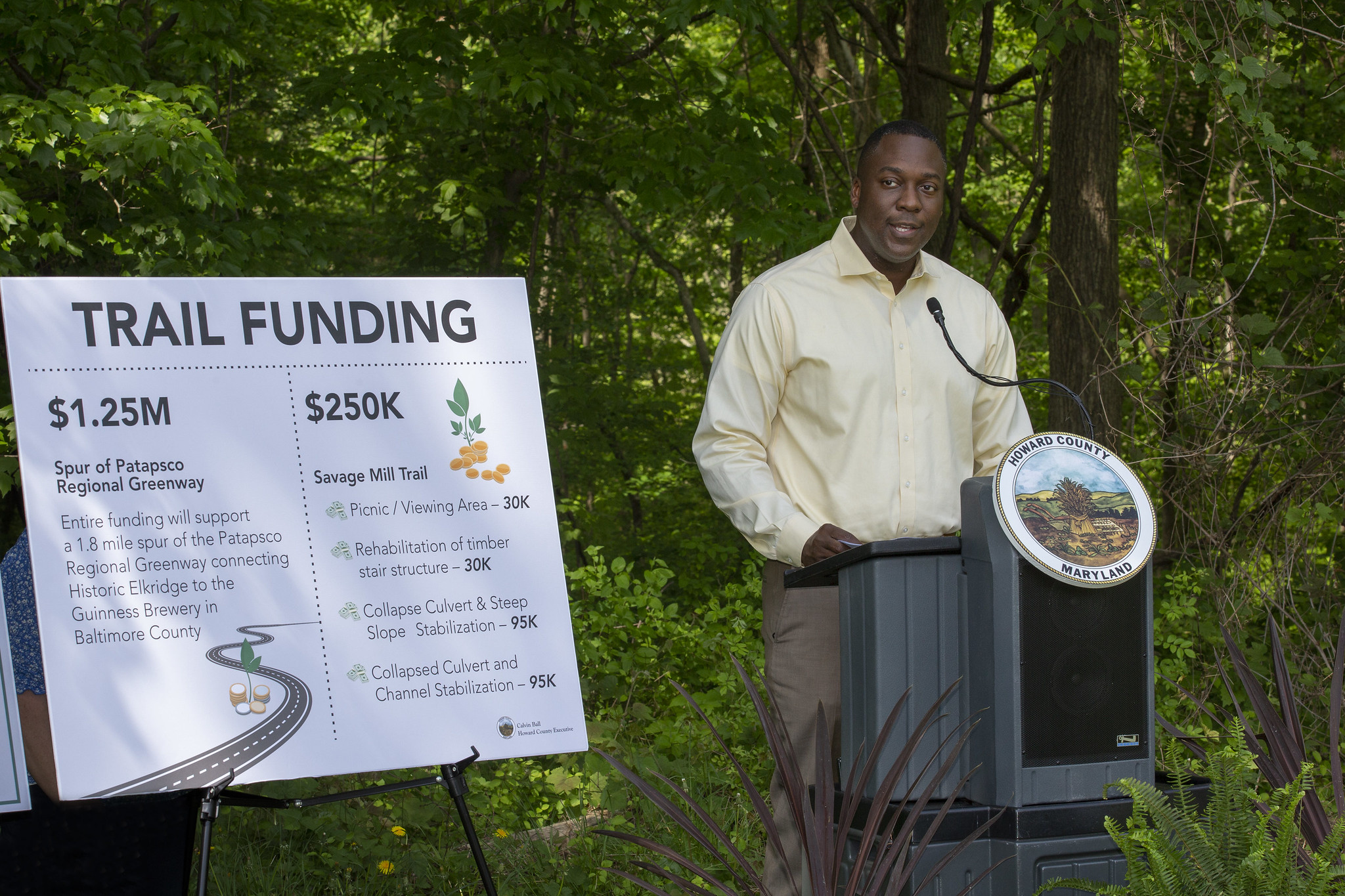 ELLICOTT CITY, MD – Today, Howard County Executive Calvin Ball was joined by local and state officials to announce $1.5 million in State for the Savage Mill Trail and the Patapsco Regional Greenway spur connecting Elkridge to the Guinness Brewery in Baltimore County. Photos of the event can be found here.