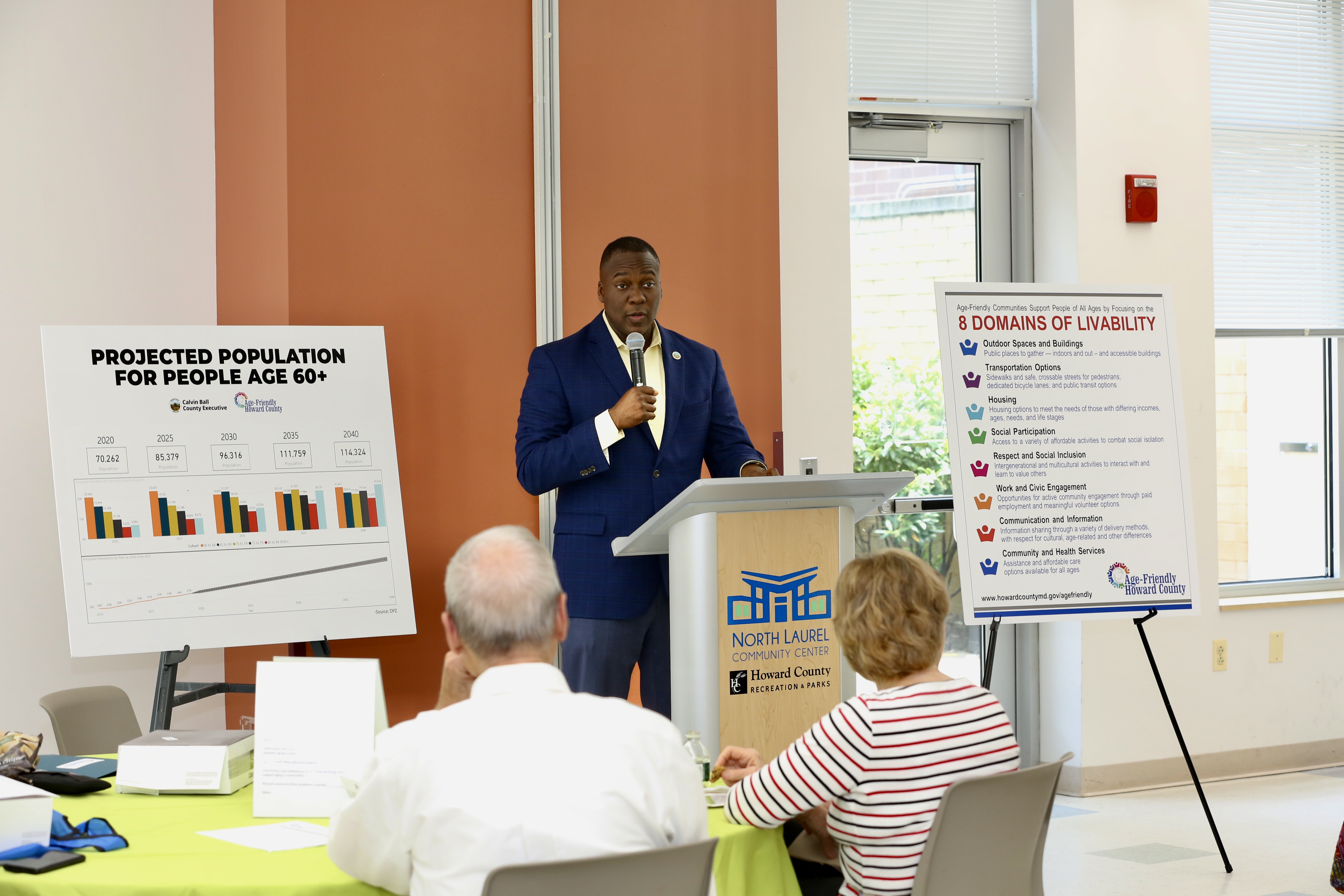 ELLICOTT CITY, MD – Howard County Executive Calvin Ball and the Office on Aging and Independence today hosted the first of several discussions with community members on the Age-Friendly Action Plan at the North Laurel 50+ Center. Pictures from the event can be found here.