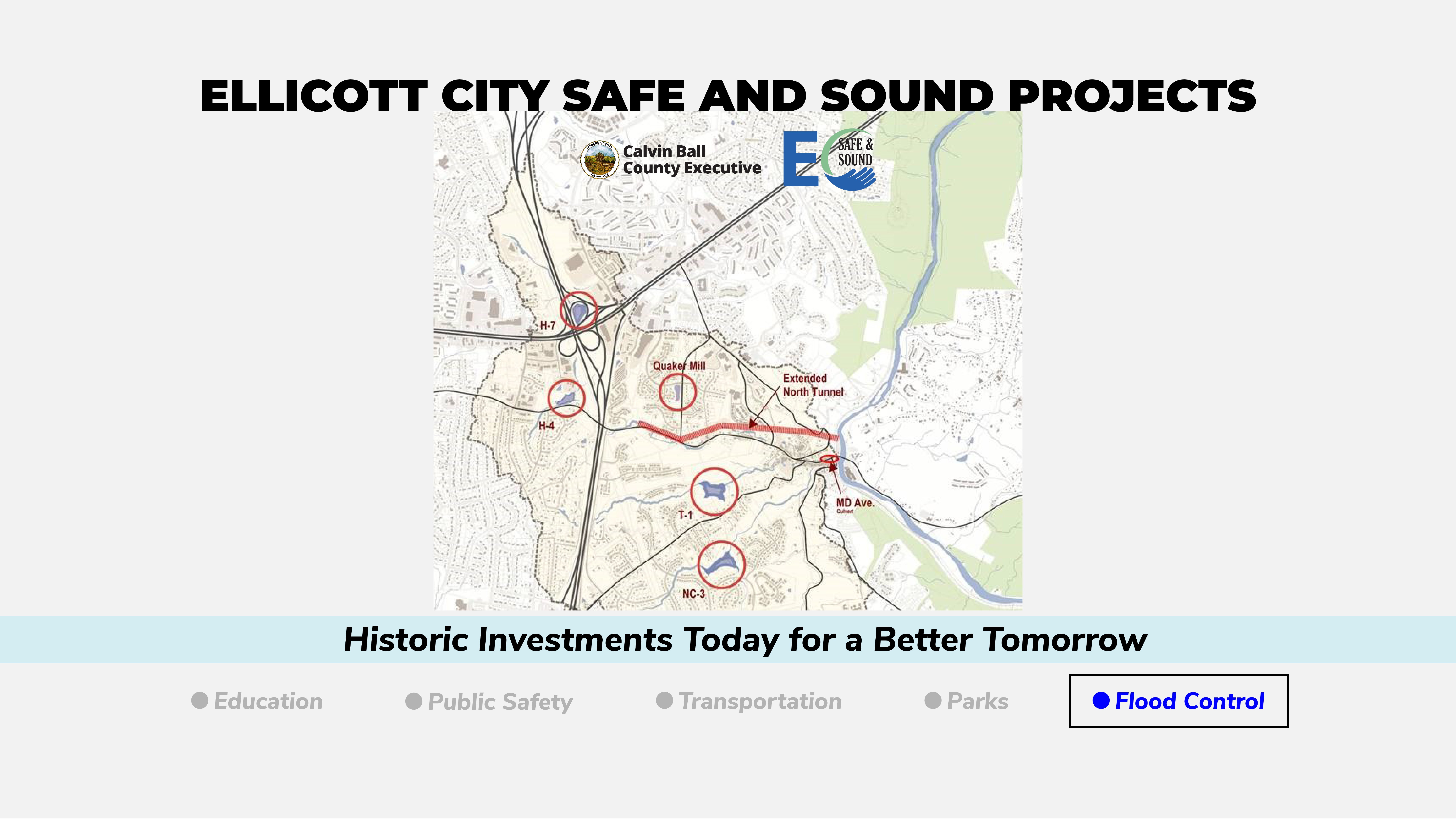 Recently, I announced the closing of a $75 million low interest federal loan to construct the Extended North Tunnel, the largest and most impactful flood mitigation component of our Ellicott City Safe and Sound plan. Once complete, this pivotal project will carry 26,000 gallons of stormwater per second, away from streets and foundations in Old Ellicott City and the West End and directly into the Patapsco River, protecting life, property, businesses and homes. The Extended North Tunnel is one of seven flood mitigation projects, including the Quaker Mill and H7 Ponds which are currently under construction and expected to be completed next year.