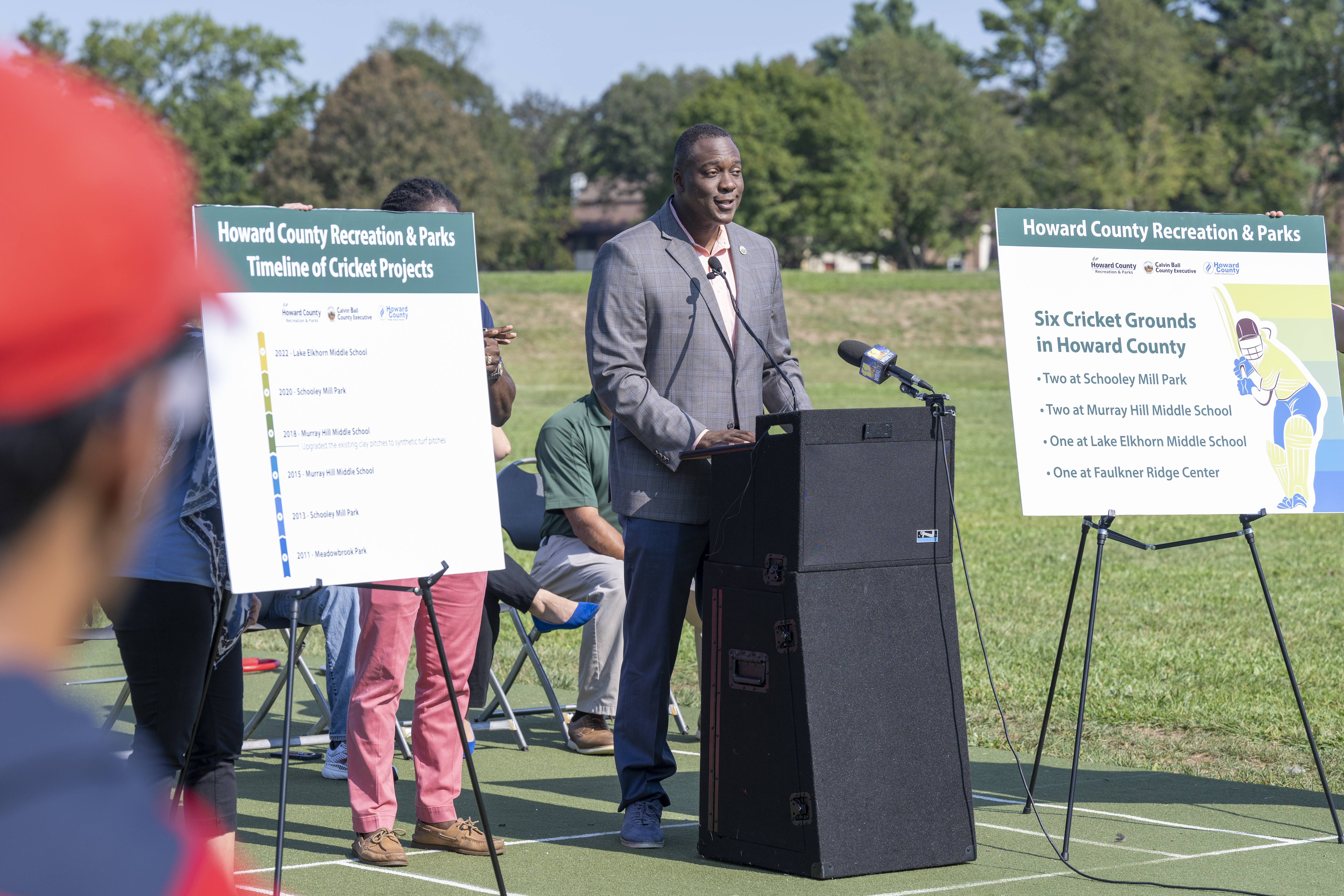 COLUMBIA, MD – Howard County Executive Calvin Ball today officially opened the County’s sixth cricket pitch and first designated youth cricket pitch at Lake Elkhorn Middle School. The County entered into an agreement with the Howard County Board of Education last summer to construct and maintain the new cricket pitch. Pictures from the event can be found here.