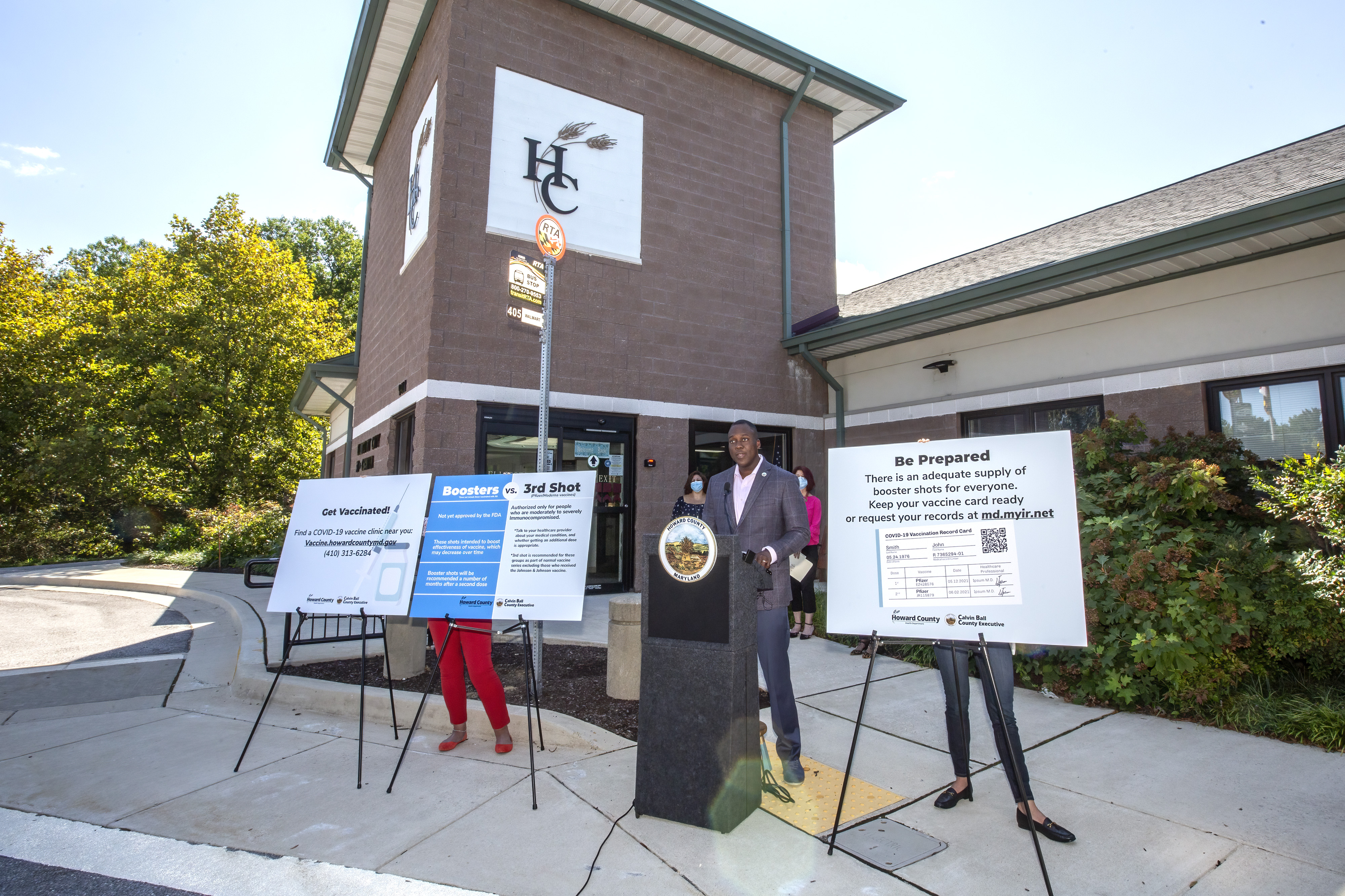 ELLICOTT CITY, MD – Today, Howard County Executive Calvin Ball was joined by Howard County Health Officer Dr. Maura Rossman to share information regarding third doses for immunocompromised residents and preparation for booster shots in the coming months. People with moderately to severely compromised immune systems are currently eligible for a third shot at this time and can find a clinic nearby at vaccine.howardcountymd.gov. For the general population, booster shots have not yet been authorized by the Food and Drug Administration (FDA), but will be recommended many months after residents received their second dose of the Moderna or Pfizer vaccines. Photos of the event can be found here.