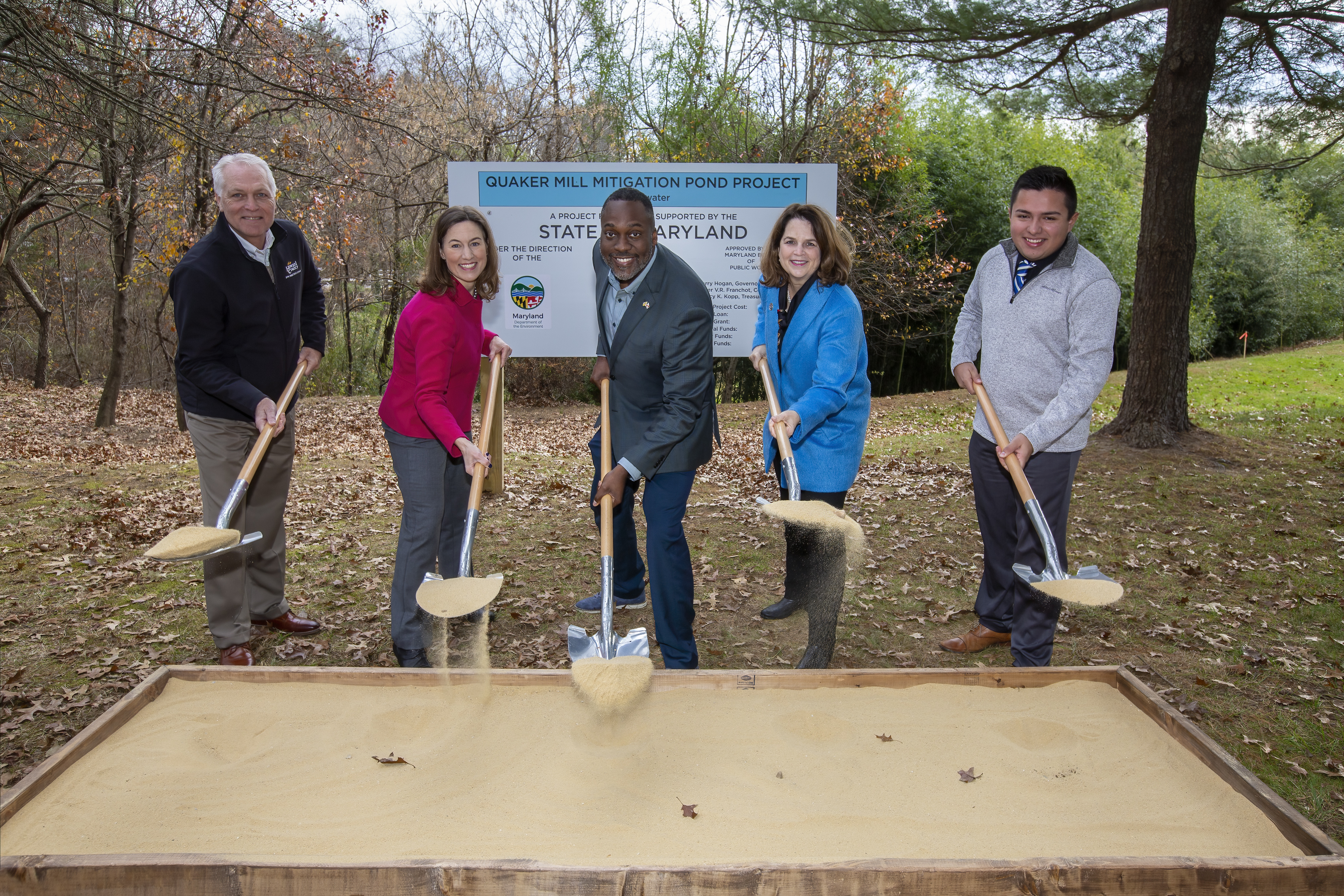 ELLICOTT CITY, MD – Howard County Executive Calvin Ball today broke ground on the Quaker Mill Flood Mitigation Pond, a critical Ellicott City Safe and Sound project. Once complete, this project will provide approximately 10-acre-feet of storage, which is the equivalent of nearly 3.3 million gallons of water. The Quaker Mill Pond is the second retention and conveyance project slated to mitigate flooding that is now underway, four other projects are in the design phase. Construction on Quaker Mill Pond is anticipated to take approximately 15 months, weather dependent. Photos of the event can be found here.