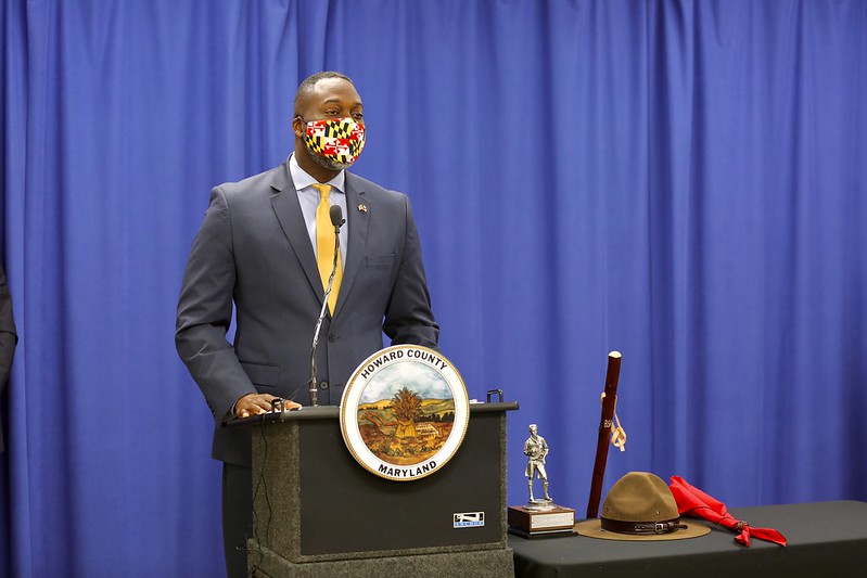 ELLICOTT CITY, MD – Today, Howard County Executive Calvin Ball was presented the Good Scout Award from the National Pike District of Boy Scouts of America. The Good Scout Award is presented to those who exemplify, in their daily lives, the values and ideals of the Boy Scouts of America, which are expressed in the Scout Oath and Scout Law. Photos of the event can be found here. Video can be found here and below.