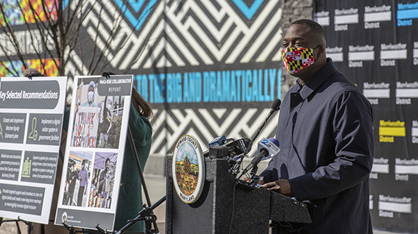 ELLICOTT CITY, MD – Today, Howard County Executive Calvin Ball marked the one-year anniversary of Howard County’s first COVID-19 case and released the HoCo RISE Collaborative Report, outlining recommendations and a path forward for continued response and recovery from the pandemic. County Executive Ball launched the Collaborative in November 2020 and charged the 50 members to provide key recommendations in five areas: Public Health Response, Government Response, Jobs and the Economy, Education and Workforce, and Family Opportunities. Photos of the event can be found here. To read the full report, please click here.