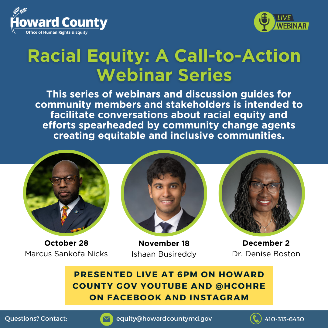 Join the Office of Human Rights and Equity on at 6p.m. on Monday, November 18th for the second live webinar in our Racial Equity: A Call-to-Action Webinar Series. This series of webinars and discussion guides for community members and stakeholders is intended to facilitate conversations about racial equity and efforts spearheaded by community change agents creating equitable and inclusive communities. Join at @HCOHRE on Instagram and Facebook or @HowardCountyGov on YouTube for a live viewing of the webinars, or visit any of these pages to view a recording (recording published 30 minutes after live session ends).