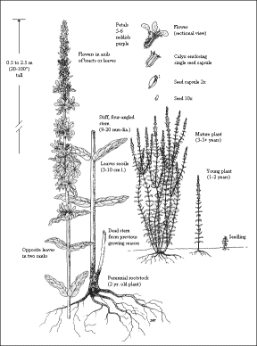 Lythrum salicaria is an introduced, hard, aggressive perennial that occurs predominately in wetland habitats. Originally from Europe, it was inadvertently introduced to the U.S. in the 1800's in ship ballast water and intentionally as a medicinal herb. It can now be found in 40 of the lower 48 states and Canada.